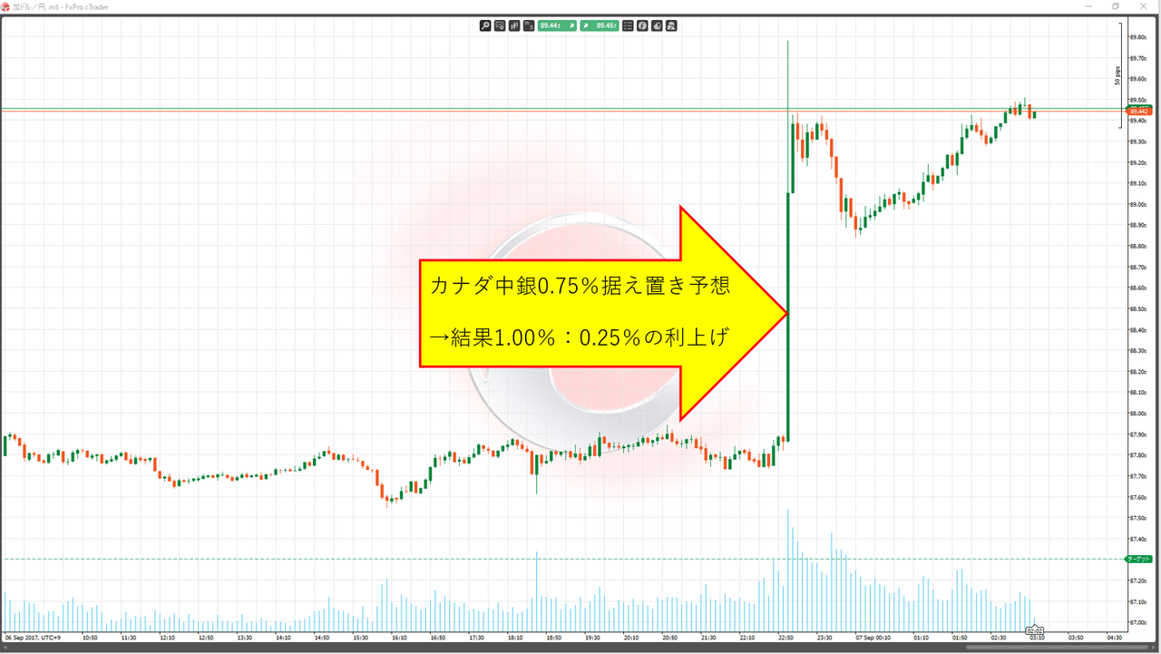 サプライズの利上げにカナダドルは瞬間で150pips以上の上昇となりました。