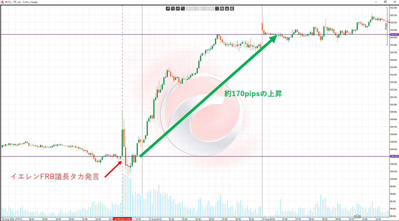 昨年2016年8月のシンポジウムでは、ハト派のイエレンFRB議長とフィッシャーFRB副議長のタカ派発言で、ドル円が約170pipsの上昇となっています。