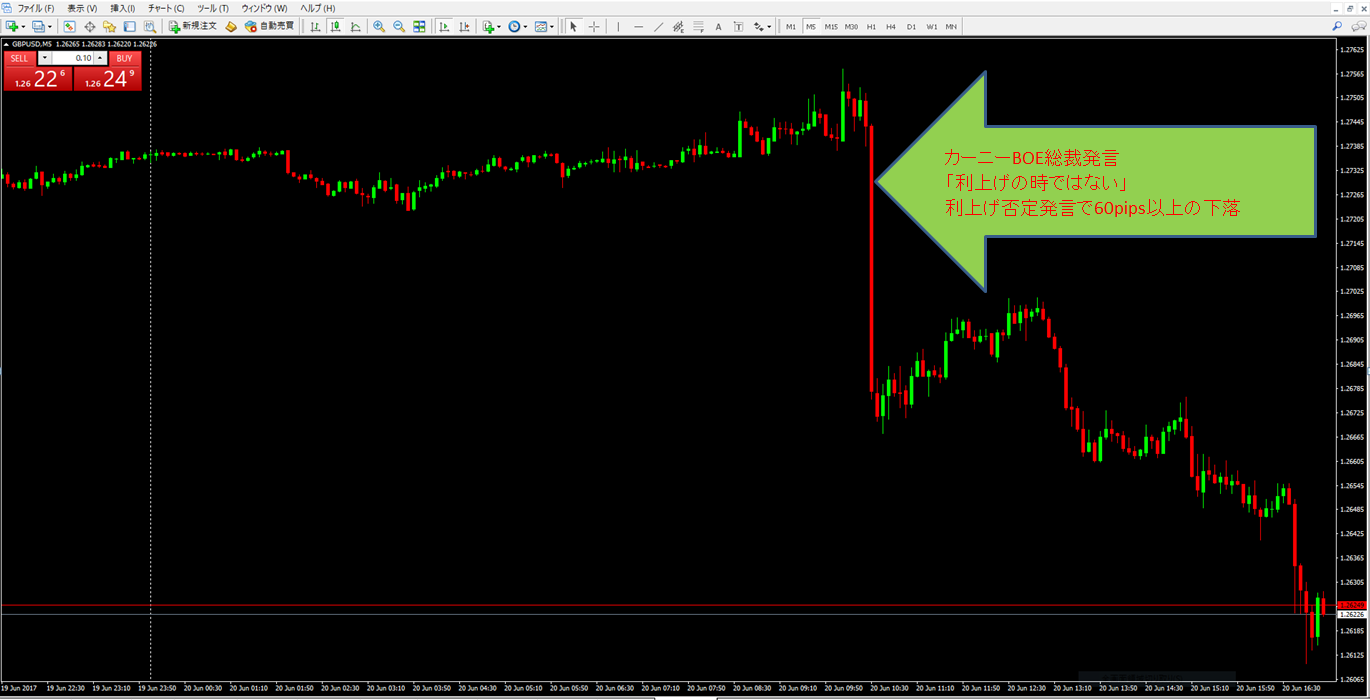 カーニー総裁は、「インフレ圧力は低下、利上げ時期ではない」と発言したことによりポンドは大きく売られることになりました。