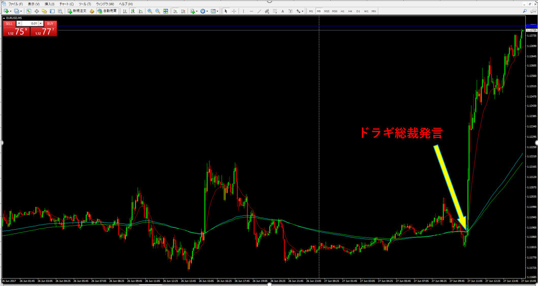 ドラギECB総裁のサプライズ発言でユーロが急騰しています。