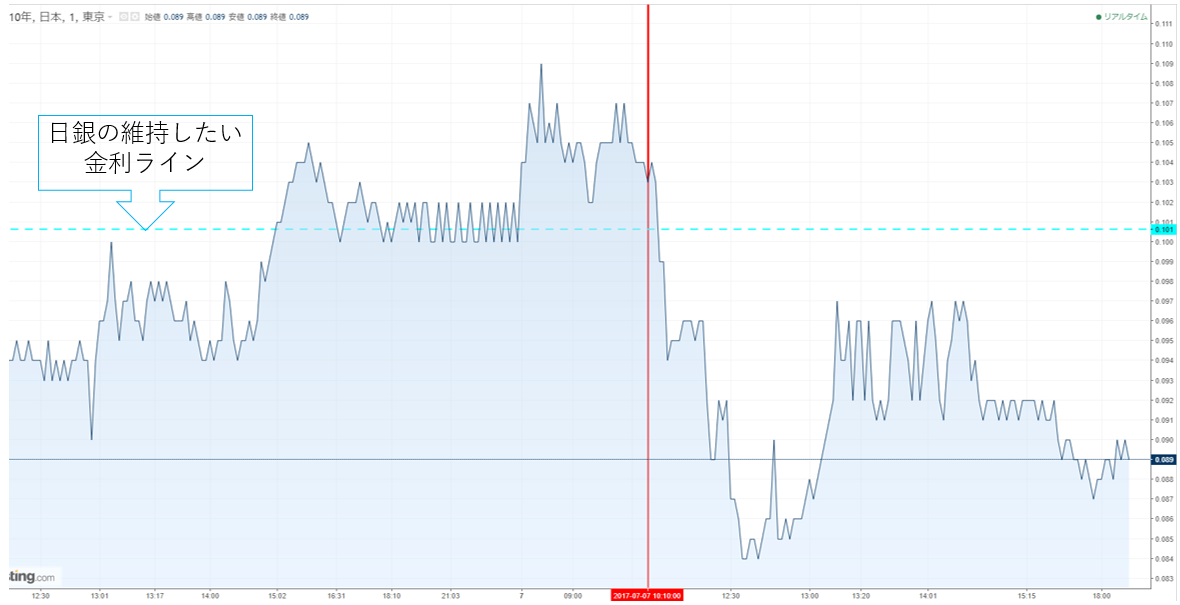 日銀の維持したいライン(0.100%)を超えているので、07月07日10:10に指値オペを通告しました。