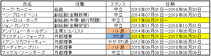 前回の金融政策決定会合で利上げ票を投じたフォーブスさんは、メンバーの中で1番のタカ派の存在でしたが、2017年06月30日の任期満了後に退任することになっています。(まだ1期目なので、通例として2期務めることが多い)