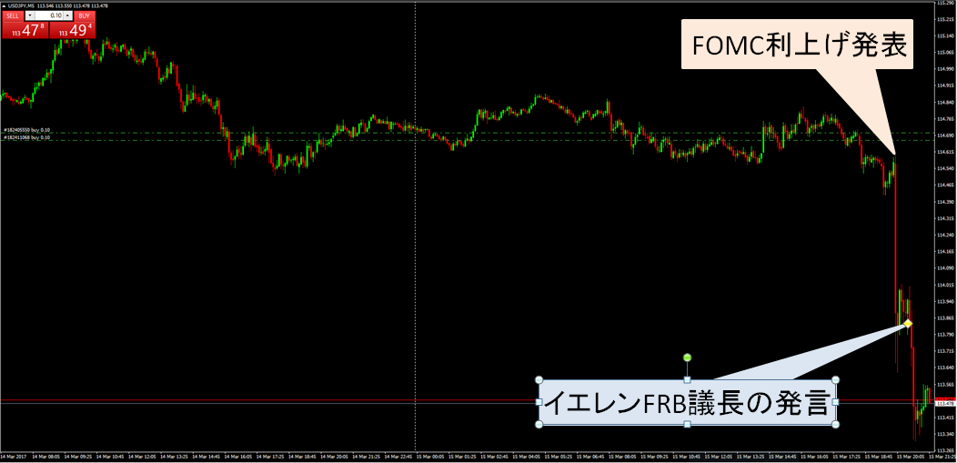 また、その後のイエレンFRB議長の発言でさらにドルは売られることとなった。