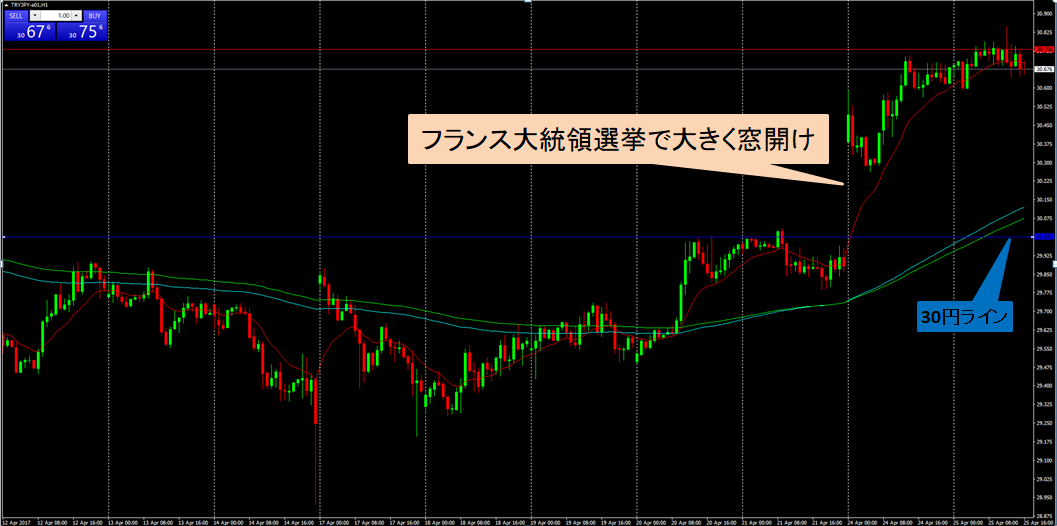 フランス大統領選挙でリスクオンになったことでトルコリラ/円は30円台回復しています。