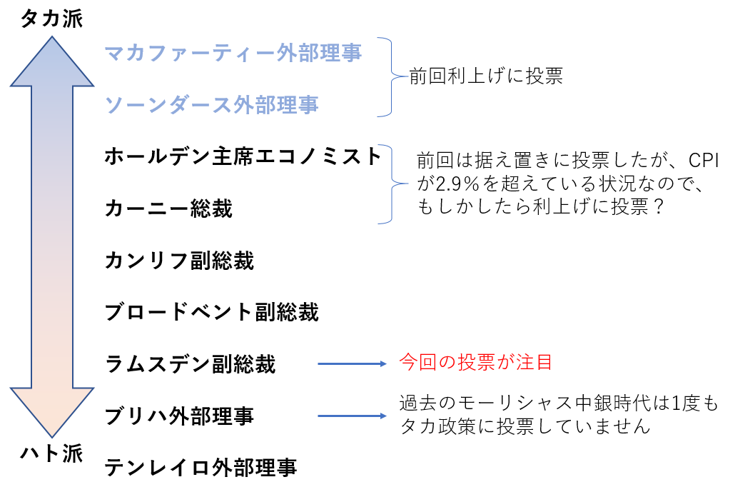 MPC(金融政策委員会)メンバーは本来9名で構成されているのですが、シャーロット・ホッグ前副総裁が急遽辞任したことで8名しかいませんでした。